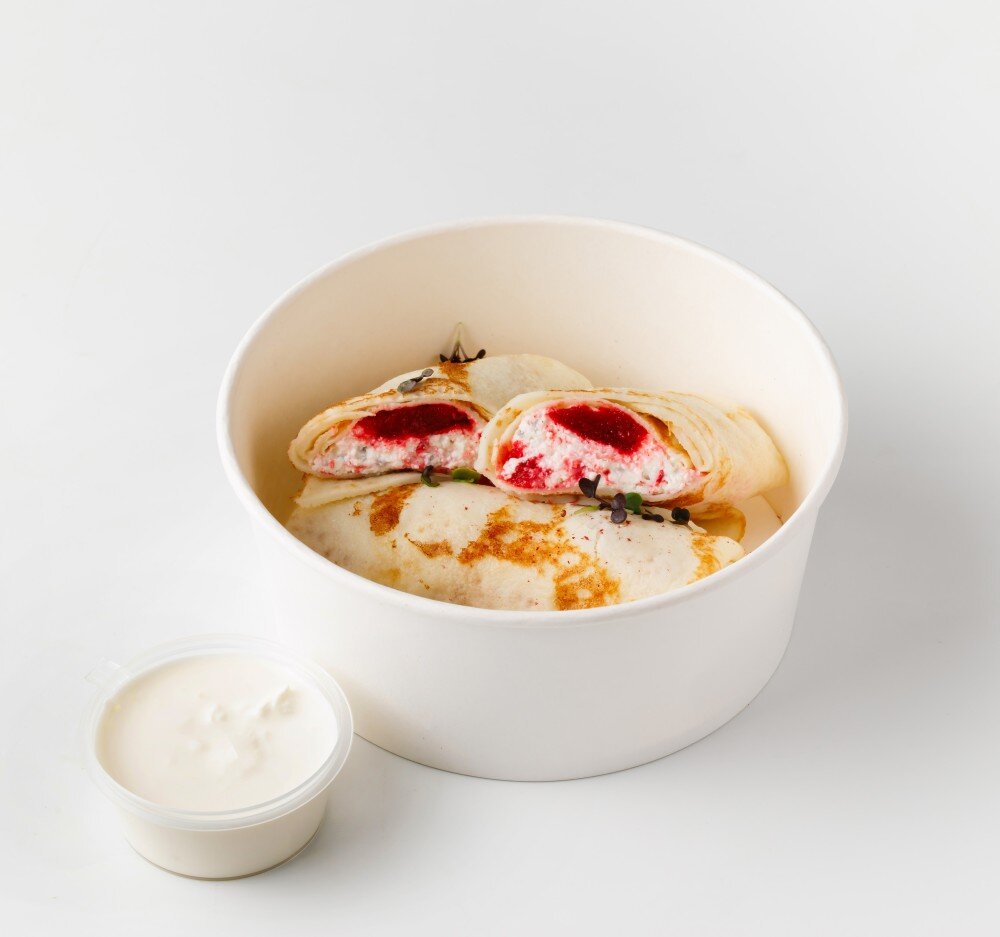 Блины с творогом и клубникой Нежные блинчики на цельнозерновой муке. Подаются со сметаной КБЖУ на порцию 391/16/25/25