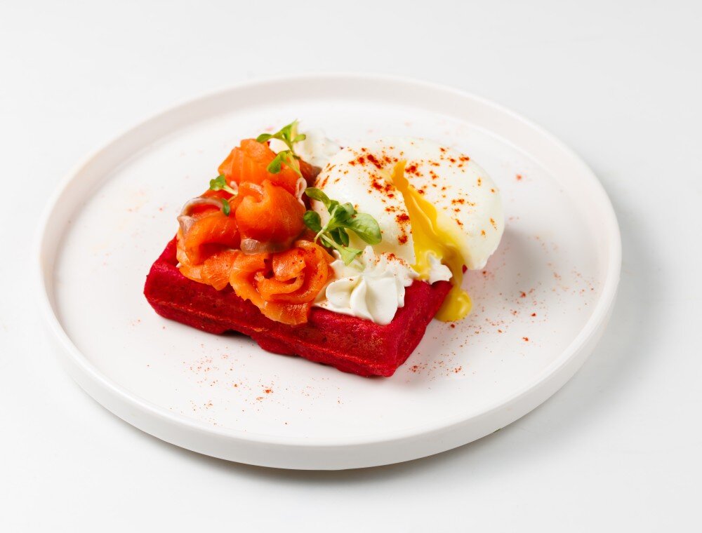 Безглютеновая вафля с взбитым творожным сыром и форелью и яйцом пашот КБЖУ на порцию 472/22,5/25/42