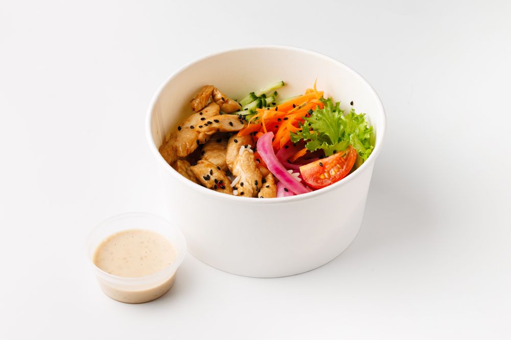 Курица терияки, ферментированная морковь, свежий огурец, красный лук, черри, листья салата, кунжут, орехово-кунжутный соус КБЖУ на порцию 623/28/24/59